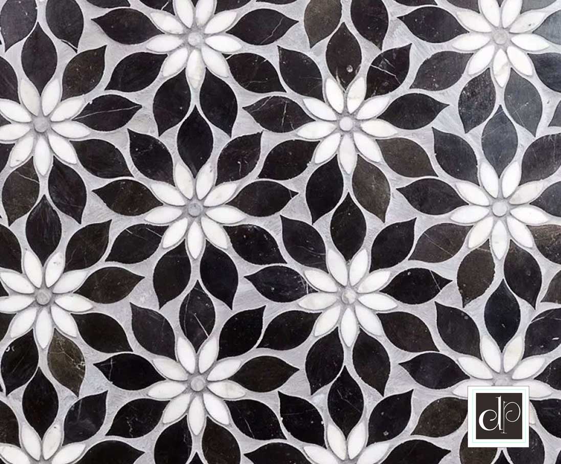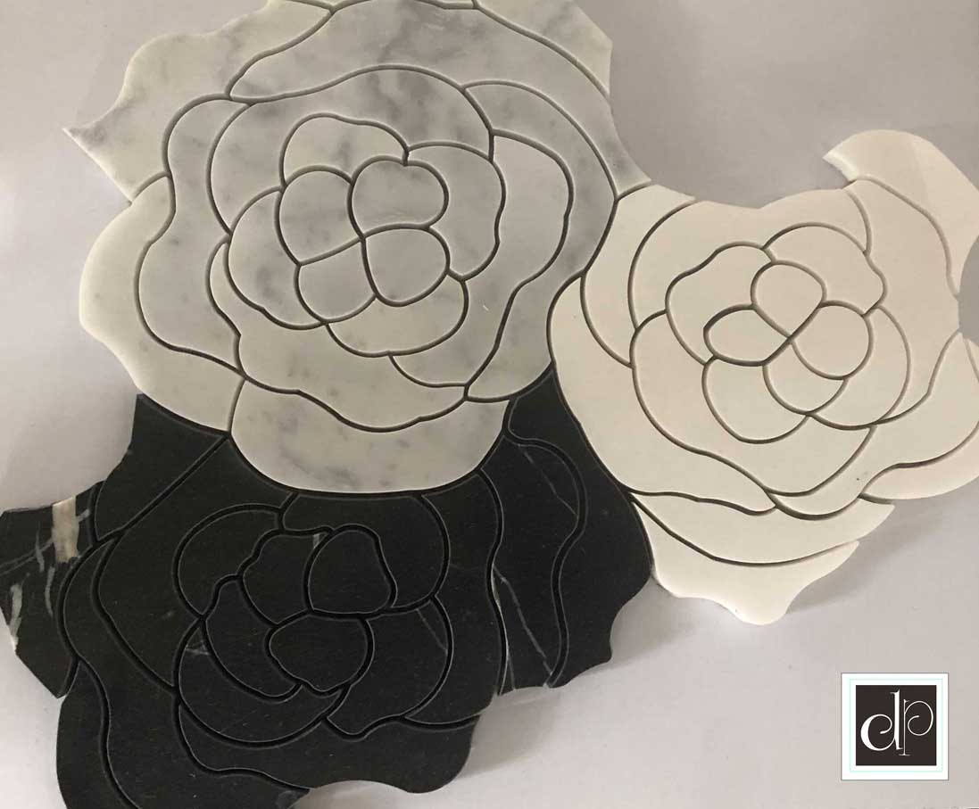 We have a very wide range of marble mosaics including these amazing waterjet mosaics. The exotic beauty of these mosaics lies in the color contrasts drawn out by light as only marble can do. One part style, another part grace, these waterjet designs will illicit envious looks and compliments. Refashion an entryway, fireplace, or accent wall into a dreamscape